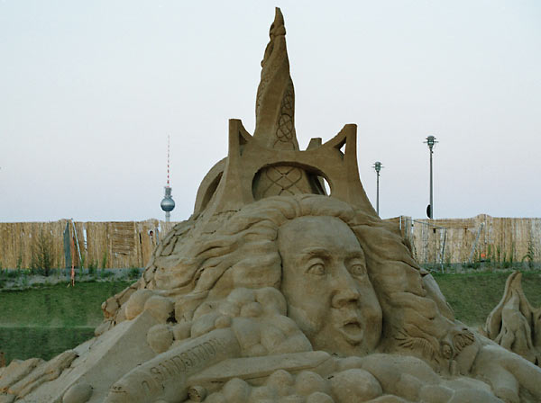 Sandsation-Festival 2004. Der Kern der Hauptsculptur. Er stellt die Elemente Feuer, Wasser, Erde, Wind dar. Links ist knapp das Element Erde sichtbar, frontal bläst das Element Wind.