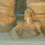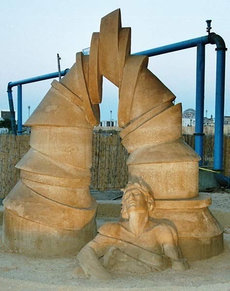eine imposante Baustelle mit einer unauffälligen Sandsculptur davor.